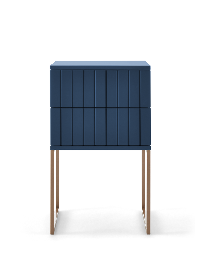 Ela possui duas gavetas ripadas com uma cava lateral que serve de puxador - não alterando em nada o desenho da peça.