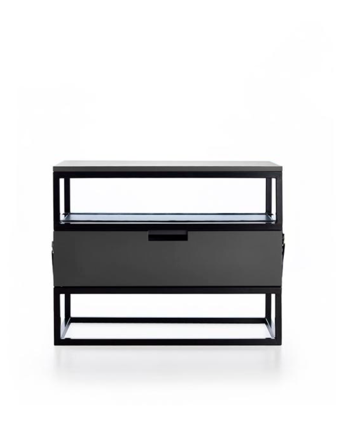 Design marcante e materiais contrastantes. O Lenny une estrutura de aço, gaveta laqueada e cintos de couro com fivelas cromadas, trazendo um toque industrial sofisticado.