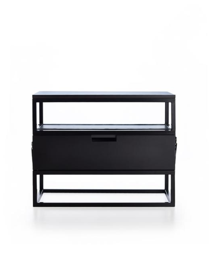 Design marcante e materiais contrastantes. O Lenny une estrutura de aço, gaveta laqueada e cintos de couro com fivelas cromadas, trazendo um toque industrial sofisticado.