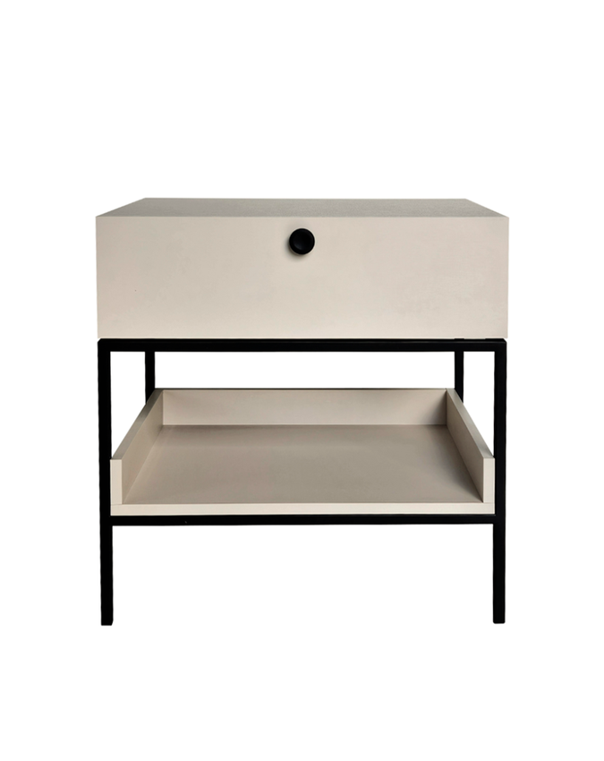 A ampla gaveta oferece espaço suficiente para manter seus pertences organizados, enquanto o nicho inferior incorpora praticidade ao dia a dia, funcionando tanto como apoio para itens de uso frequente quanto como uma prateleira para destacar objetos decorativos ou afetivos. Ela também tem fundo recuado para tomada, para acabar com as bagunças de cabos e carregadores.