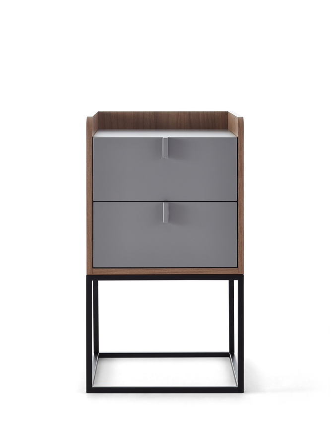 A Maria Eduarda possui uma altura média, fundo recuado para tomada, duas gavetas nas mesmas medidas e laterais elevadas, proporcionando um espaço diferenciado na base do móvel.